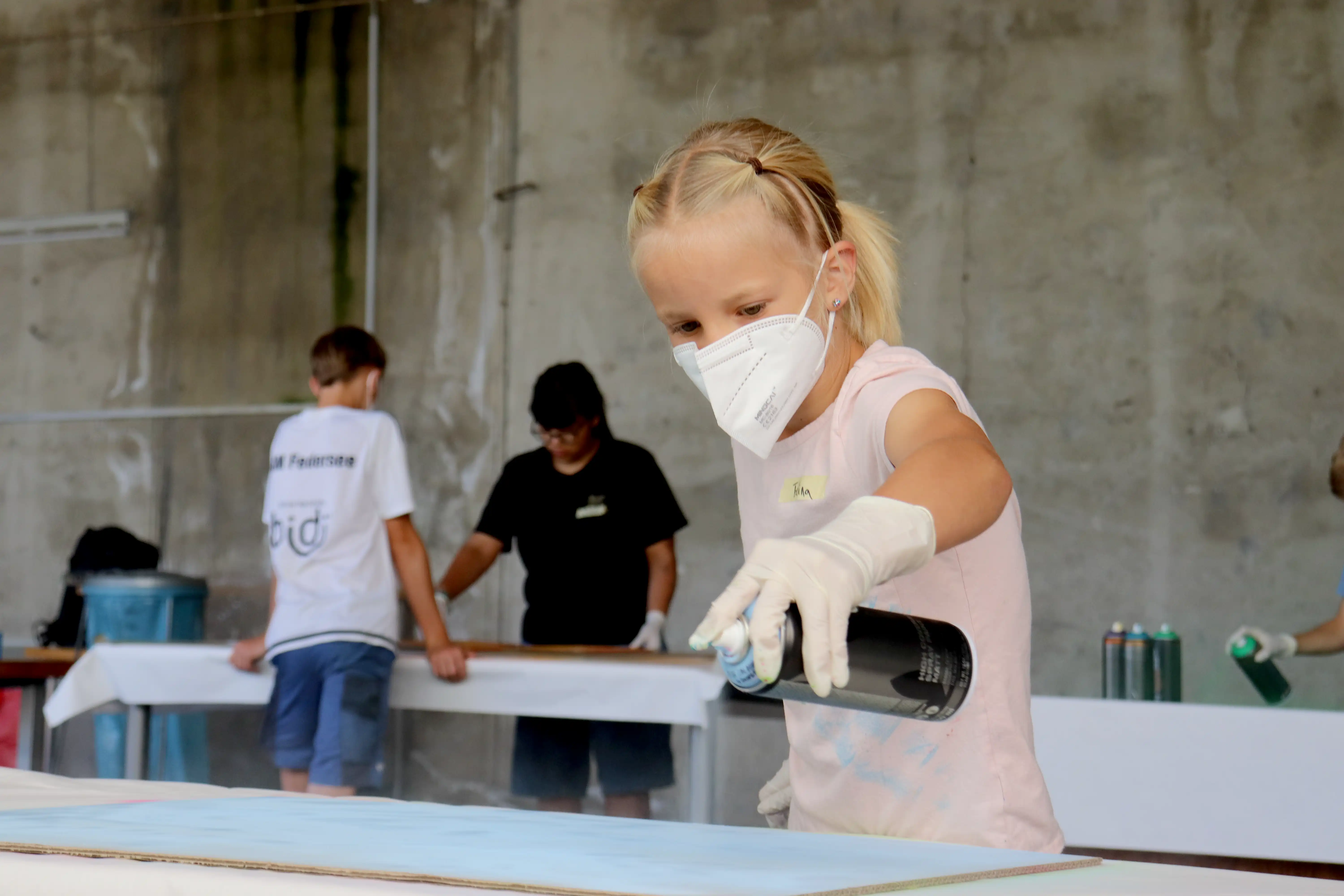 In den 2,5 Stunden wurde mit voller Begeisterung gesprüht – selbst die Papierrollen auf den Tischen fanden am Ende noch Verwendung als Leinwand. Die Rückmeldungen waren eindeutig: „Das hat Spaß gemacht!“ und „Das war cool!“ – selbst bei sommerlichen Temperaturen.