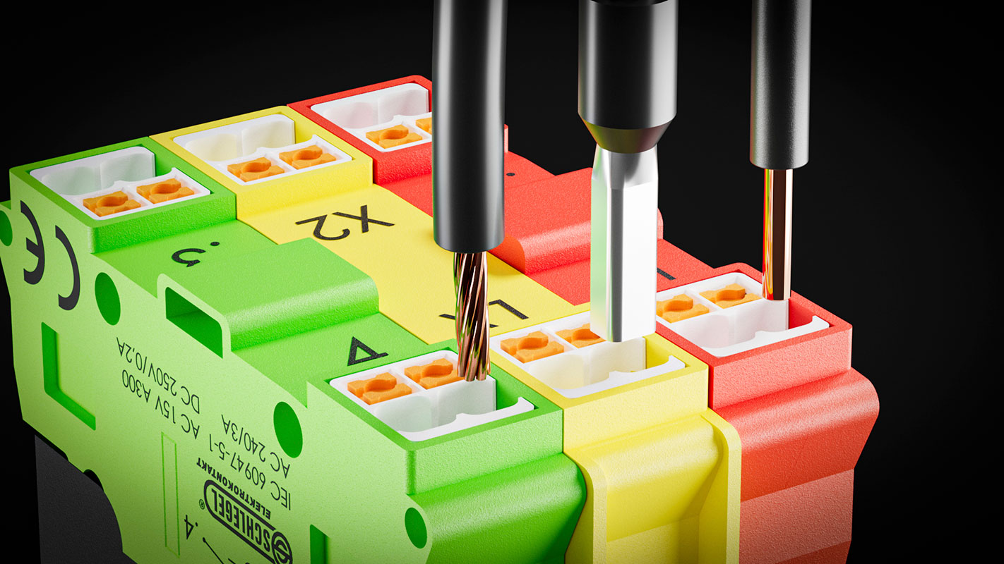 Die SCHLEGEL-Push-In-Kontaktelemente besitzen auf jeder Seite zwei Einführungen für Kabel mit einem Querschnitt von 0,5 mm² bis 1,5 mm² und zwei sogenannte „Pusher“. Diese Druckstifte werden nur benötigt, wenn Kabel mit geringer Knickfestigkeit angeschlossen oder montierte Kabel wieder gelöst werden müssen. Zum Betätigen des „Pushers“ reicht ein herkömmlicher Schraubendreher oder ein vergleichbares Werkzeug. Damit die Anschlüsse leichter zugänglich sind, wurden diese nicht seitlich angebracht, sondern nach unten ausgerichtet.