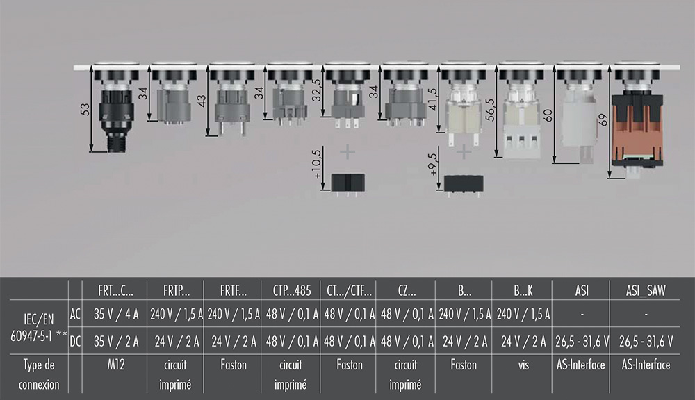 ** Indications maximales de tension ou de courant, celles-ci peuvent être inférieures selon l‘article, par ex. pour les contacts en or ou le nombre de connexions.